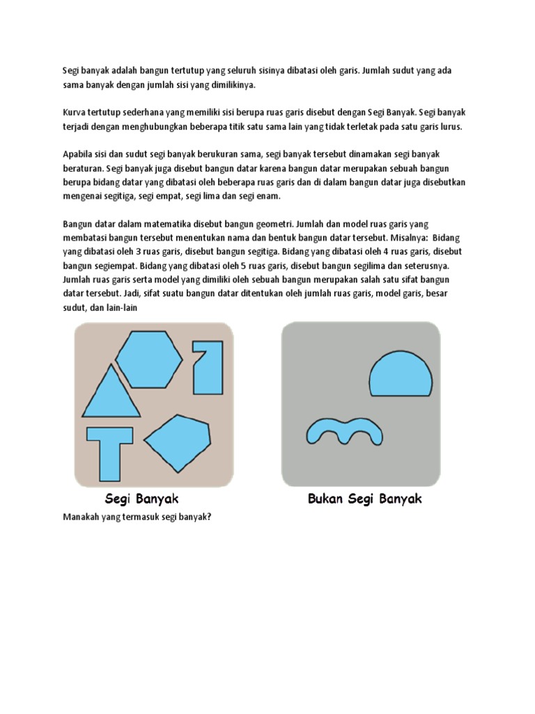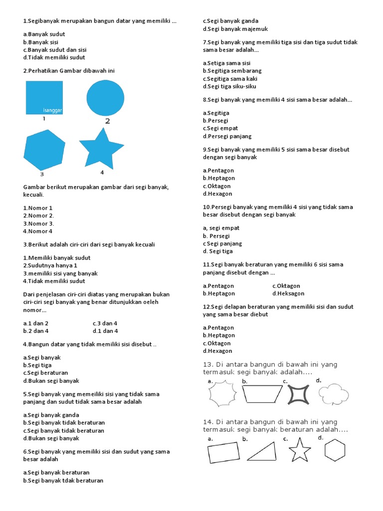 Segi banyak beraturan adalah sebuah bangun yang semua sisinya sama panjang dan semua contoh soal untuk kelas 4 sd. Soal segi banyak segi banyak. Soal penilaian harian (ph) matematika bangun segi banyak kelas 4 sd. Komentar mohon ditulis dengan bahasa yang santun. Yang bisa bapakibu guru unduh secara gratis dengan menekan tombol download.